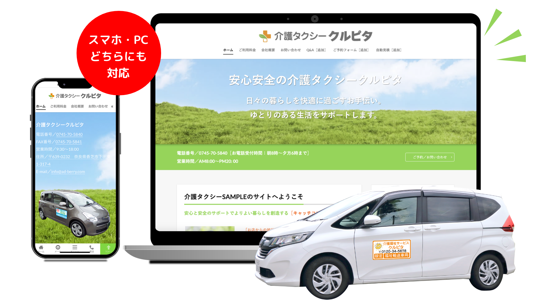 検索エンジンに強い基本設定もすべて含まれているので、「地域名+介護タクシー」で見つけてもらいやすくなります。